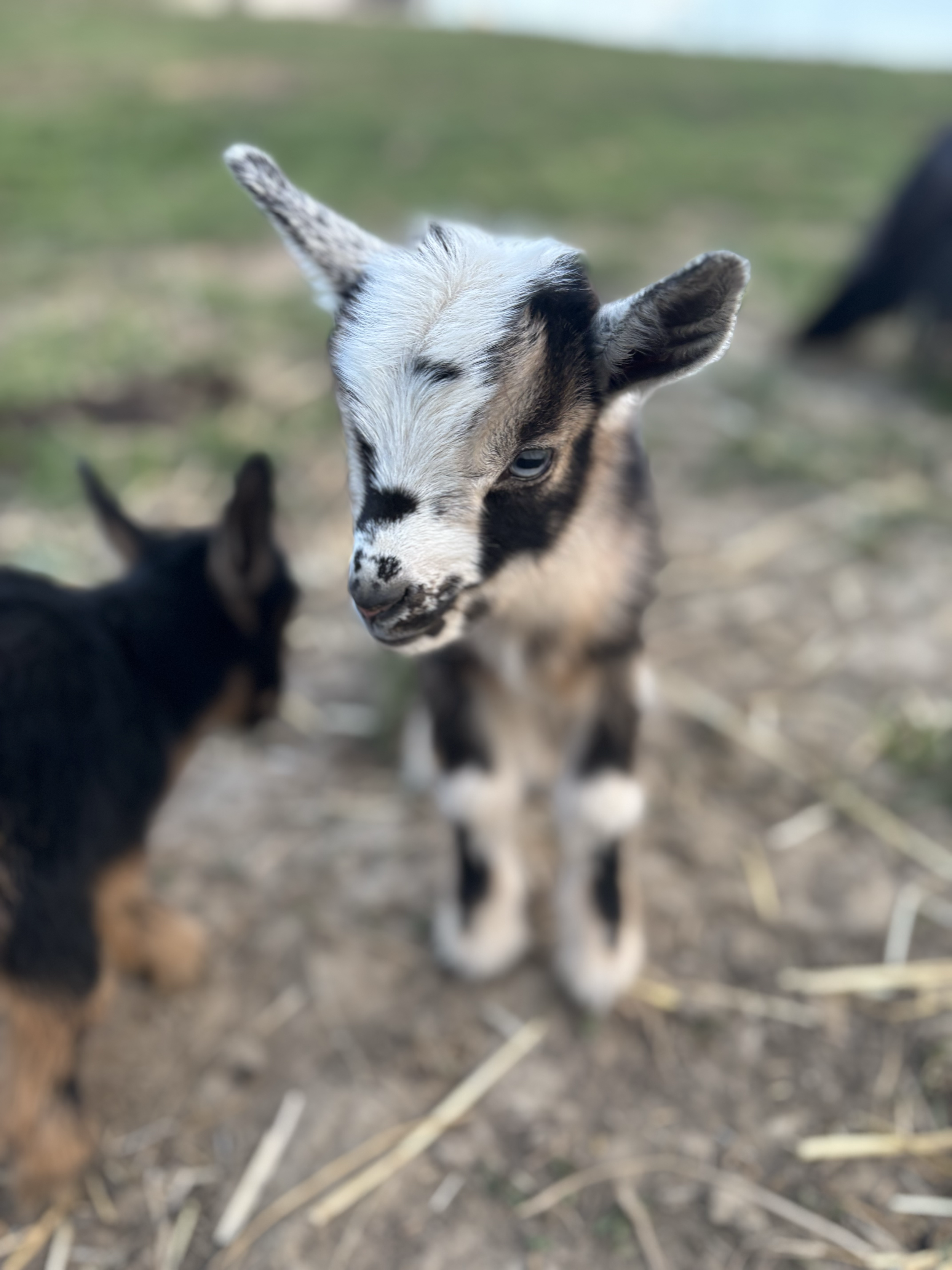 Ok, ok, I know I’m not supposed to have favorites, but Levi is one of them! He is Leonard’s twin. For some reason, his mama rejected him, and he became my bottle baby. He is spoiled rotten and follows me all over the farm. He loves to be petted, snuggled, and held. He rides around on the side-by-side and has even left the farm to go to the occasional bonfire! He is also incredibly smart and a little Houdini, always getting out of his pasture to come find me.